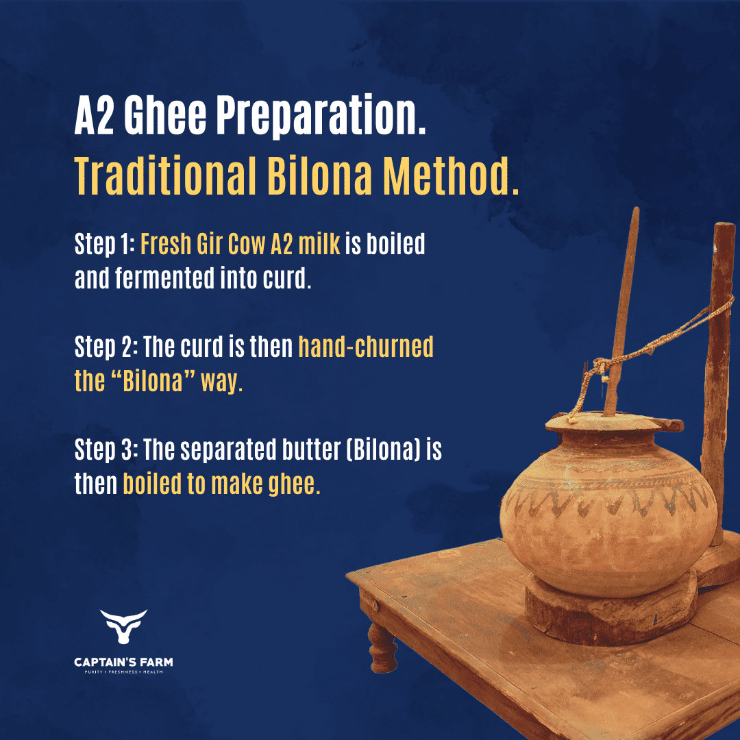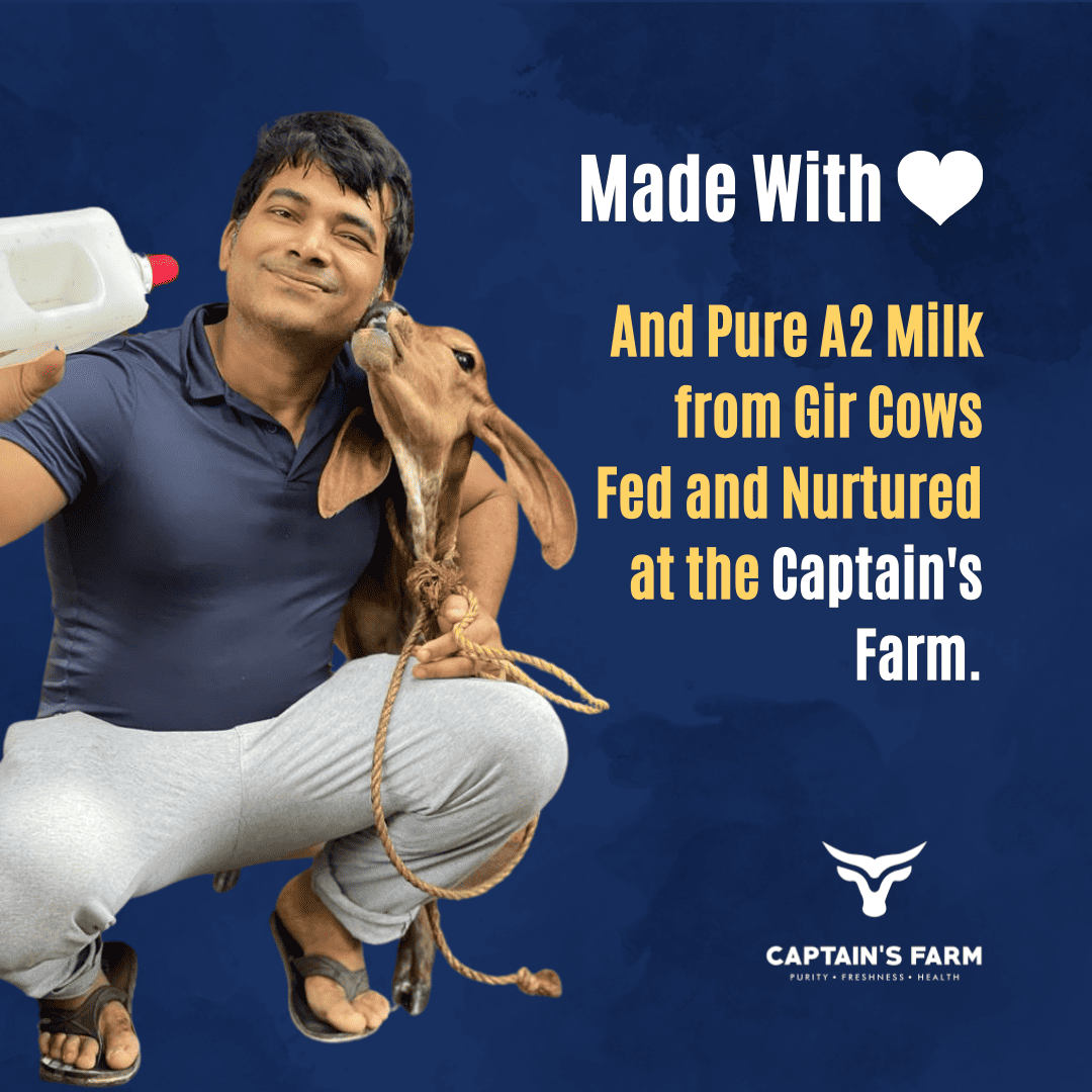Mother’s love, packed in a jar. About Captain’s Farm A2 Desi Cow Ghee A2 milk ghee is a mother’s love, packed in a jar. Made from pure A2 milk of grass-fed Gir cows using traditional Vedic methods, A2 desi cow ghee is chemical-free. This organic desi cow ghee has its own aromatic flavour and natural nutrients. It is also well-suited for the Indian diet. How? The nutritive fatty acid in the ghee is produced from A2 milk, which is full of easy-to-digest protein – A2 protein. Here’s the process of making A2 Cow Ghee: